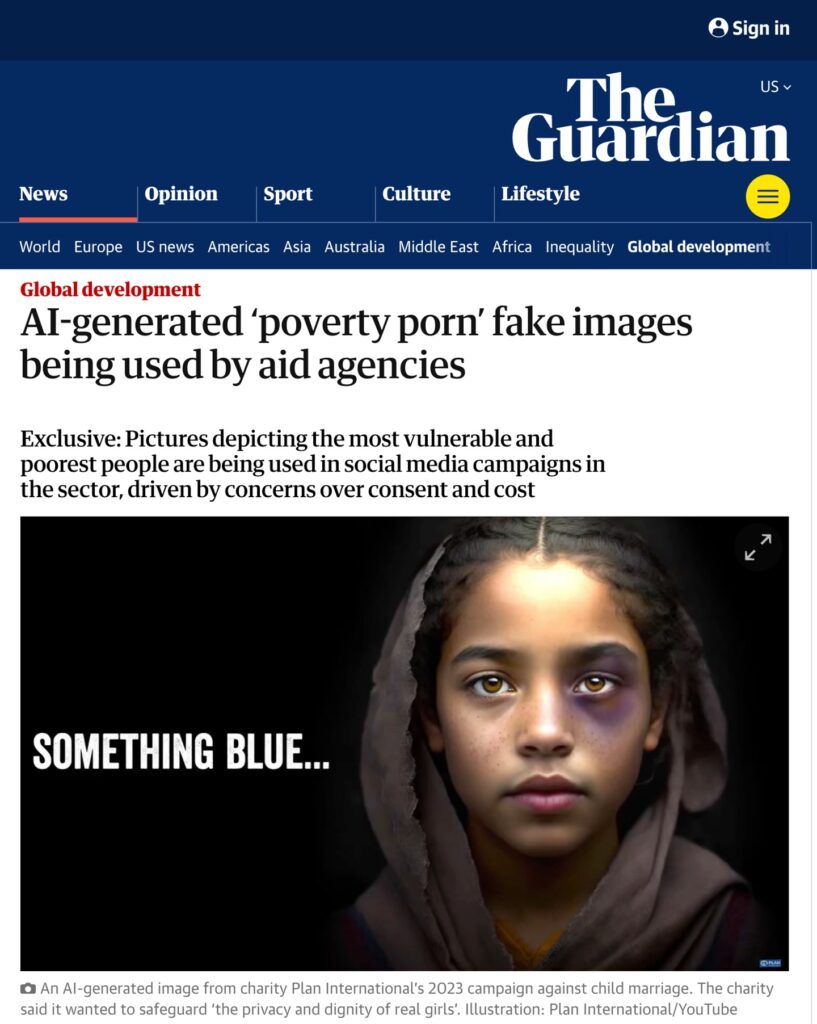 実際、AIイメージの使用は国連や大手慈善団体にも広がっている。2023年、英国のプラン・インターナショナルのオランダ支部は、児童婚反対キャンペーンにAI生成の少女の画像を使用。翌年には国連が内戦下の性的暴力をAIで再現した動画をYouTubeに投稿したが、ガーディアン紙の問い合わせ後に削除された。国連は「情報の信頼性にリスクを及ぼす」として問題を認めた。