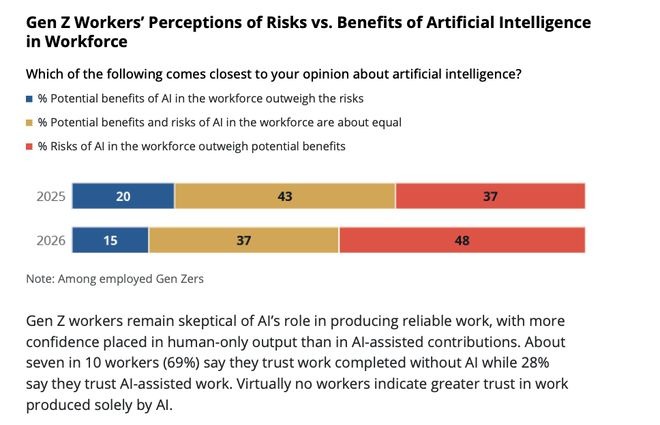 ギャラップのデータによると、すでに就職しているZ世代のうち、実に48%が「職場におけるAIのリスクは利益を大きく上回る」と考えており、この割合は1年で11ポイントも増加した。一方で「利益の方が大きい」と答えた人はわずか15%にとどまっている。