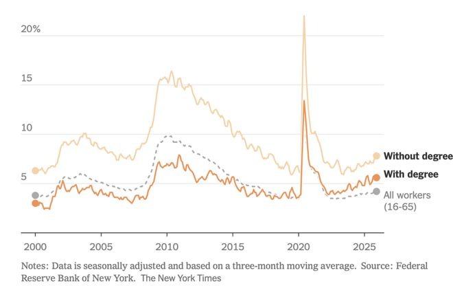 ニューヨーク連邦準備銀行のデータによれば、昨年末、22歳から27歳の大学卒業者の失業率は5.6%にまで上昇し、全体の失業率を大きく上回った。