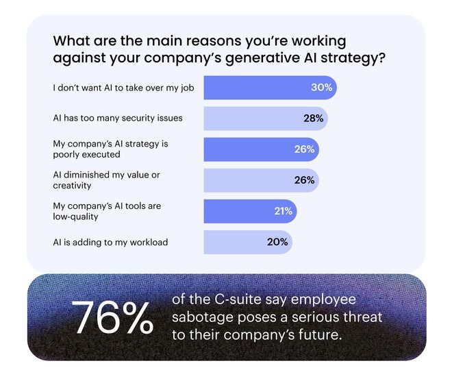 それは拒否、誤用、あるいは意図的な非効率化など、さまざまな形を取る。中には機密情報をわざとAIに入力して警告を発生させたり、AIの質の低い成果物を提出して「AIは使えない」と証明しようとする例もある。
