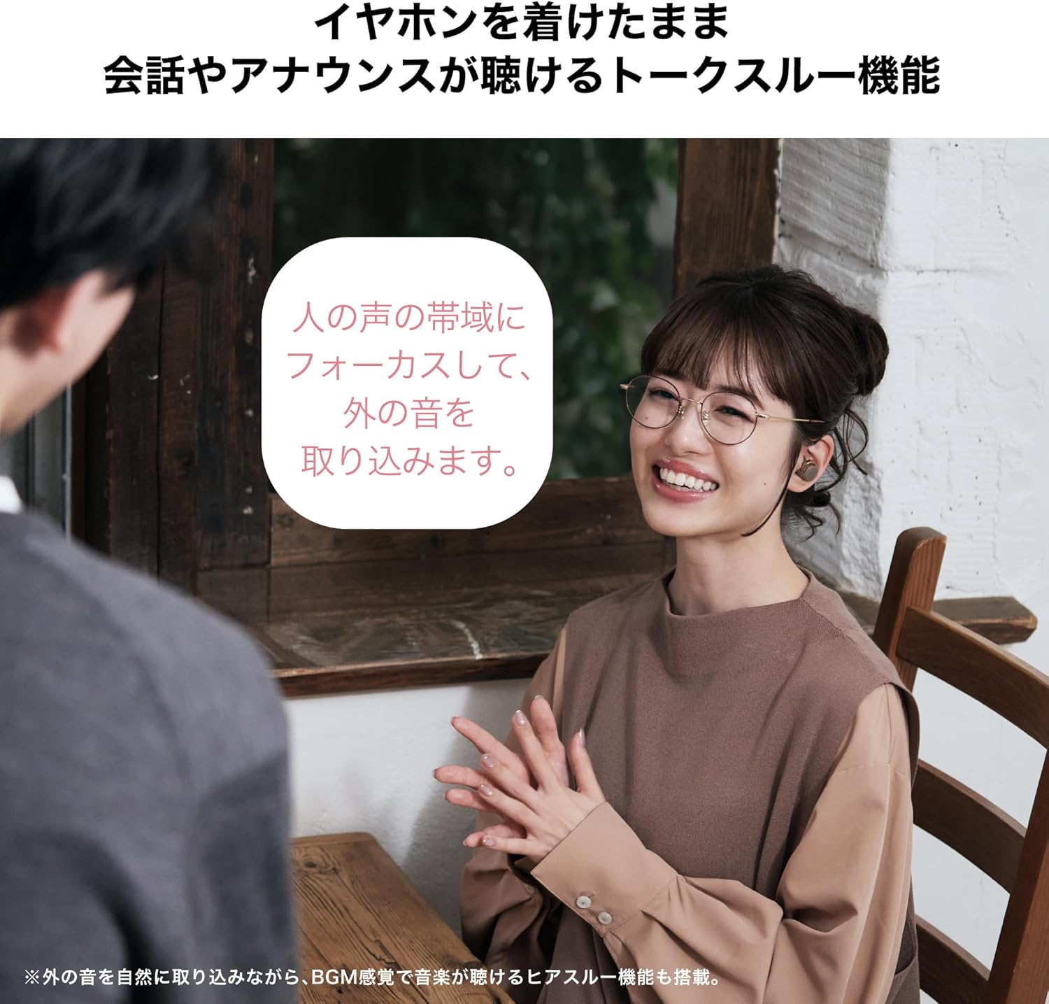 トークスルー機能は人の声帯域にフォーカスして外音を取り込み、コンビニでの会話や駅・空港のアナウンスを瞬時に聴き取れるように設計されています。ワンアクションで再生音量を下げて外音を優先するため、イヤホンを外す手間がなく、スムーズにコミュニケーションや情報確認ができるのが大きなメリットです。