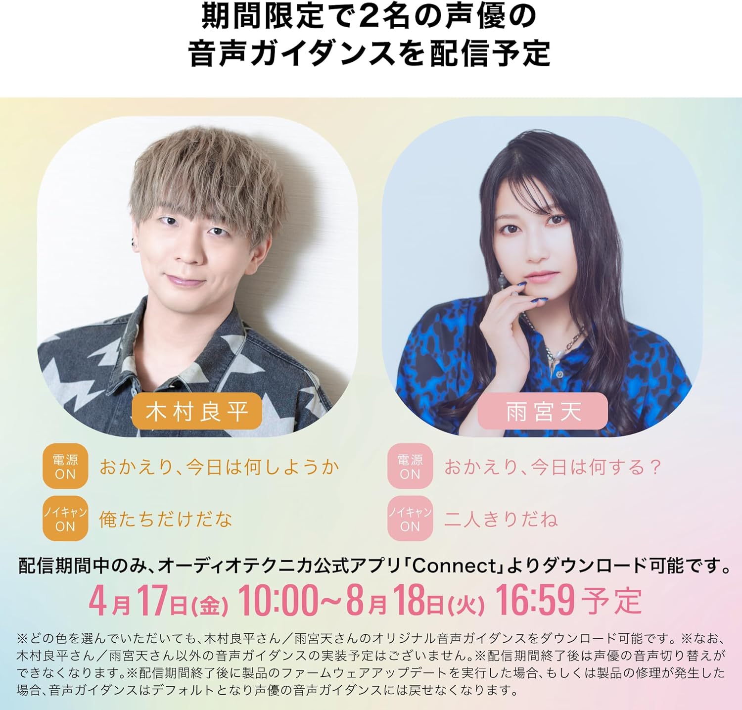 特別な企画として、木村良平さんと雨宮天さんのオリジナル音声ガイダンスを専用アプリ「Connect」で期間限定配信しています。配信期間中はどのカラーの製品でも音声ガイダンスをダウンロードして使用可能で、普段の操作時に人気声優の声で通知を受けられる特別な体験を楽しめます。音声ガイダンスはアプリを通じて切り替え可能で、期間終了後も選択中の音声は継続して使用できるため、ファンにとっては見逃せない付加価値となっています。
