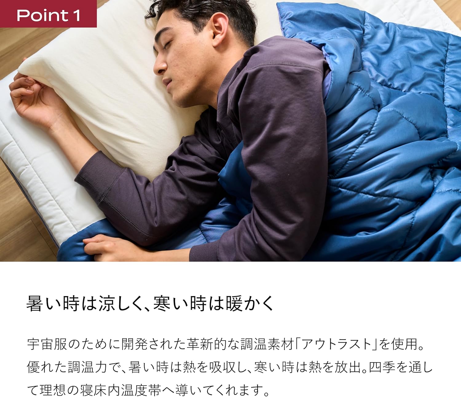 日本のように四季の寒暖差が大きく、梅雨時の湿気や夏の蒸し暑さ、冬の乾燥した寒さが繰り返される環境では、この自動調温・調湿機能が非常に有効に働き、季節ごとに寝具を変える必要なく、365 日安定した睡眠環境を提供してくれるのです。