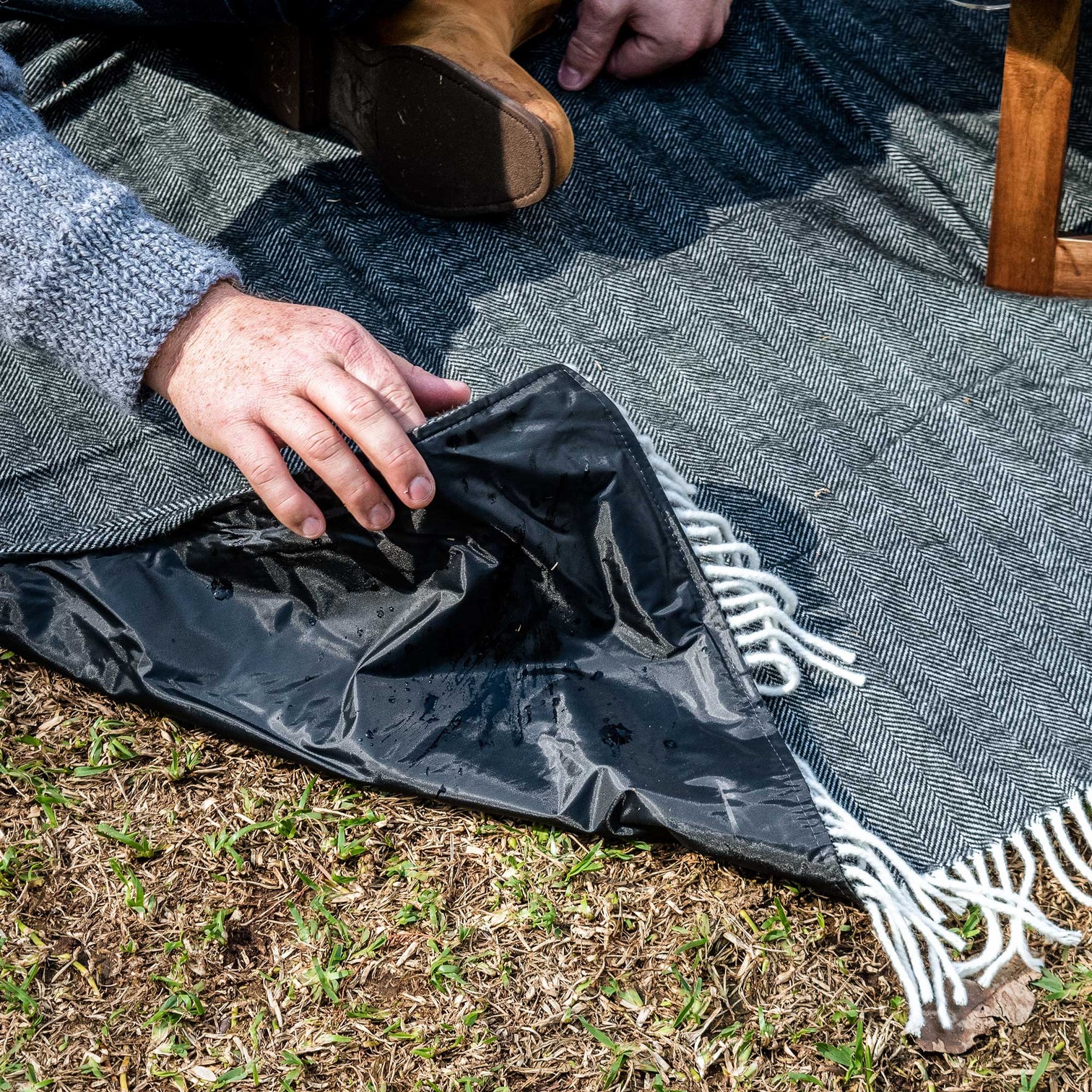 Herringbone Picnic Blanketは、柔らかなフェイクウールの表面と100%防水のポリエステルバックを採用しています。これにより、どんな地面でも快適に過ごせ、汚れや湿気から守ります。