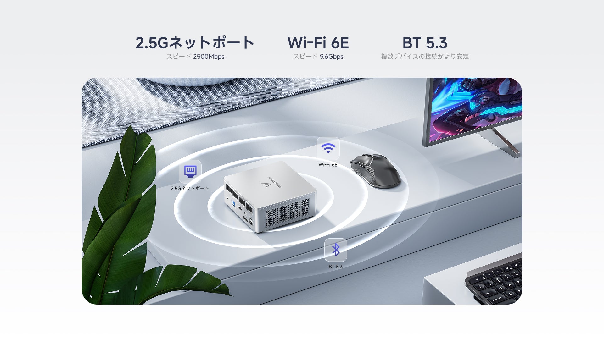 ネットワーク接続面では、2.5Gbps の有線 LAN ポート と Wi-Fi 6E、Bluetooth 5.3 を搭載しており、どの環境でも安定した高速通信が可能です。2.5G LAN は、従来の 1Gbps よりも約 2.5 倍の速度を実現し、大容量ファイルのダウンロードやアップロード、ビデオ会議時の高解像度映像伝送などに最適です。Wi-Fi 6E は 6GHz 帯を利用するため、混信の少ない周波数領域で高速かつ低遅延の通信が可能で、オンラインゲームやリモートデスクトップ操作など、遅延に敏感なタスクにも適しています。