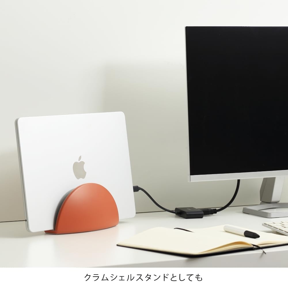 さらに、クラムシェルスタンドとしても使用可能な設計が採用されています。クラムシェルモードとは、ノートパソコンのディスプレイのみを開いて外部モニターとして使用する方式のことで、このスタンドによってディスプレイ部分を安定して保持できるため、デスクスペースを有効活用しつつ快適な作業環境を構築できます。このとき、スタンド自体が 665g の適度な重さを持っているため、機器を置いた際の倒れやズレを防ぎ、高い安定感を実現しています。