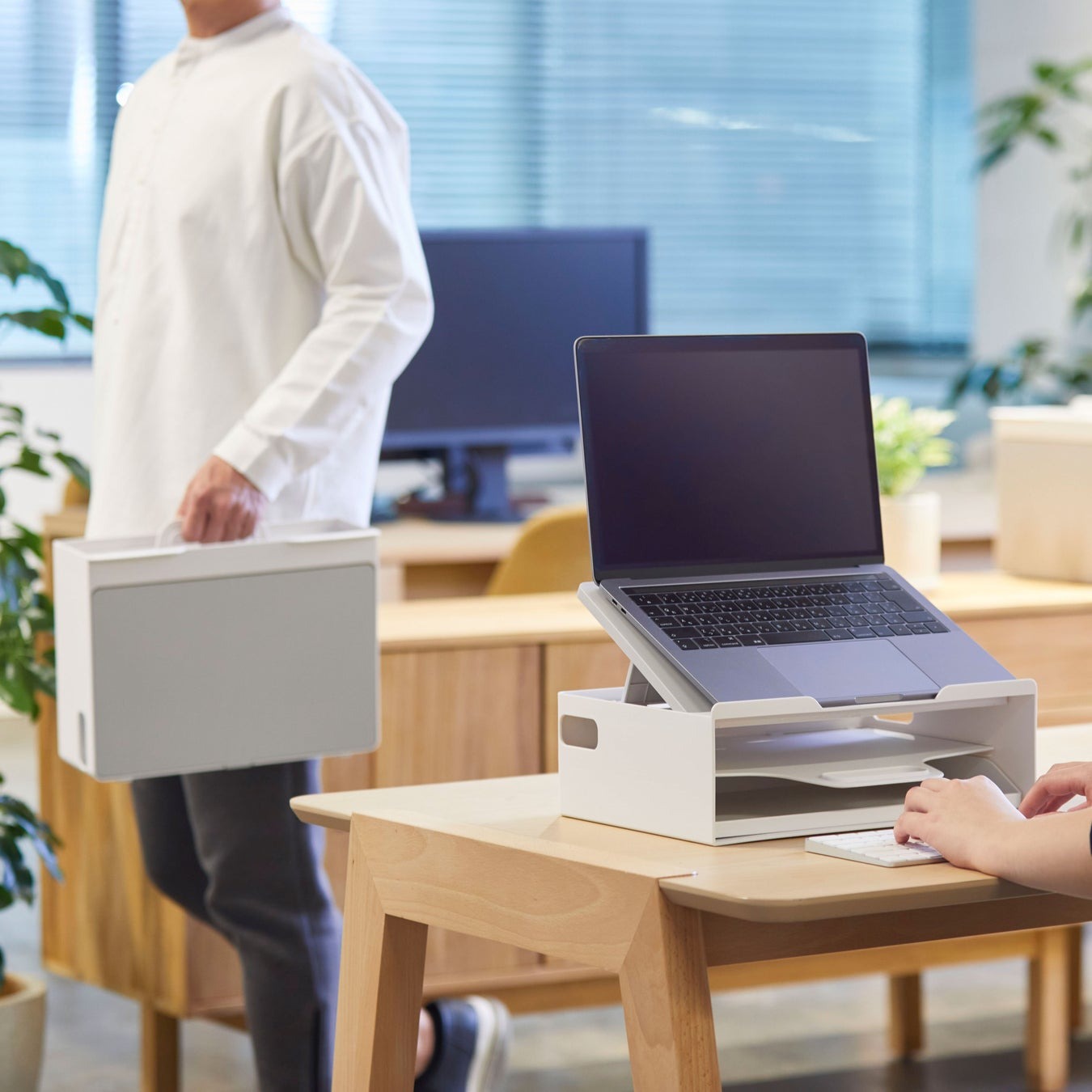 この製品は、単なるノート PC 用スタンドや収納ボックスではなく、「収納」と「作業支持」の機能を融合させた多目的ツールです。14 インチまでのノート PC に対応し、スタンドとして使用することで作業姿勢を改善したり、収納ボックスとして活用してワークツールをまとめたりすることができます。約 1.2kg と軽量ながら、5kg の耐荷重を持つため、日常の作業で安心して使用できます。材質は ABS、PP、シリコーンを采用し、耐久性と安全性を両立させています。