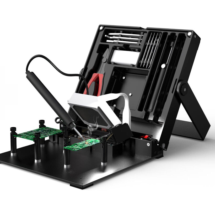 次に「コンパクト&ポータブル」なデザインが挙げられます。全体が収納可能な構造になっており、持ち運び時にはボリュームを最小限に抑えられ、バッグに入れてどこへでも持ち出せます。自宅のデスクはもちろん、学生のドームルーム、共有メイカースペース、ガレージ、さらには屋外でのフィールドリペアや展示会のブースでも、すぐに作業スペースを構築できます。このポータビリティは、「ソルダリングは作業台でしかできない」という固定観念を打ち破り、創造の場所を自由に広げます。