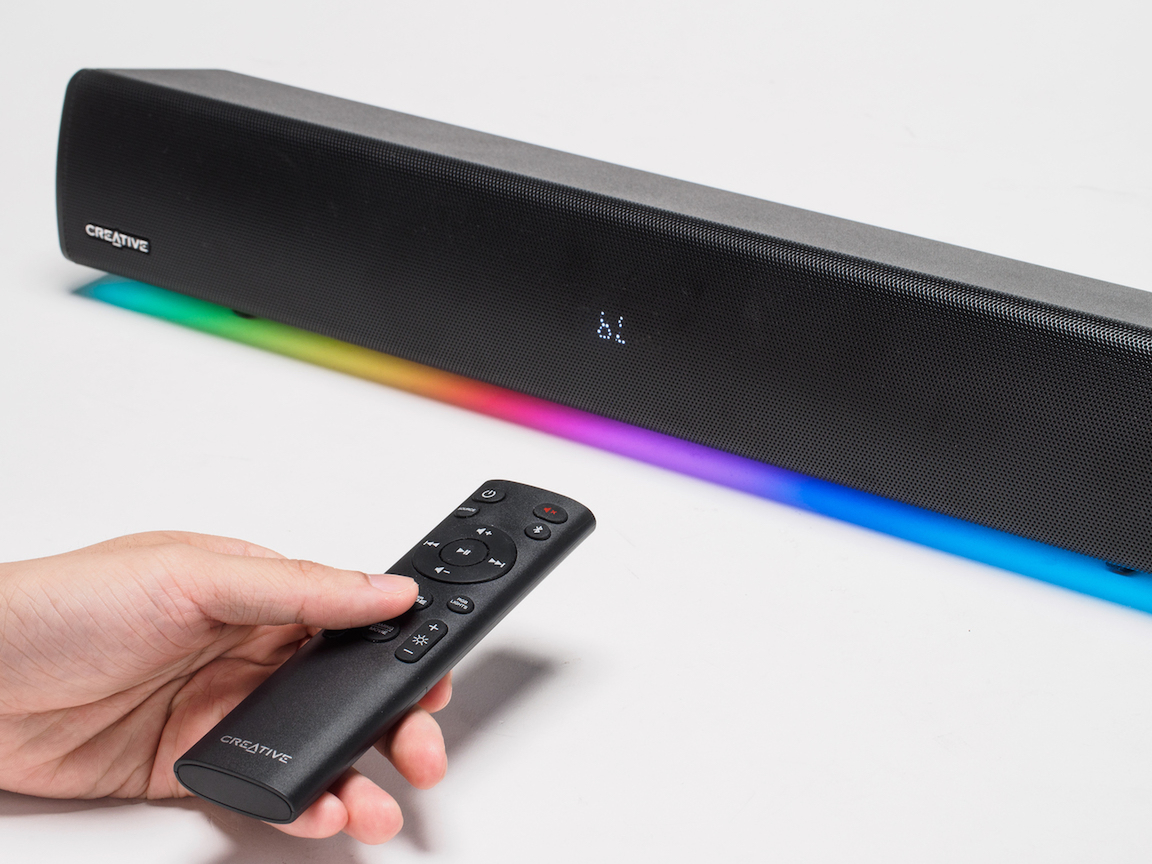 この RGB ライティングは、本体ボタンや付属のリモコンから直接操作することもできます。さらに、専用の Creative アプリを使えば、より細かい設定が可能です。例えば、音楽のリズムに合わせてライトが揺れたり、ゲーム内のイベント(例:HP 減少時)に応じて特定の色が点灯するなど、オーディオとビジュアルが連動した演出を実現します。これにより、単なるサウンドバーを超えた「体験型デバイス」としての価値を備えています。