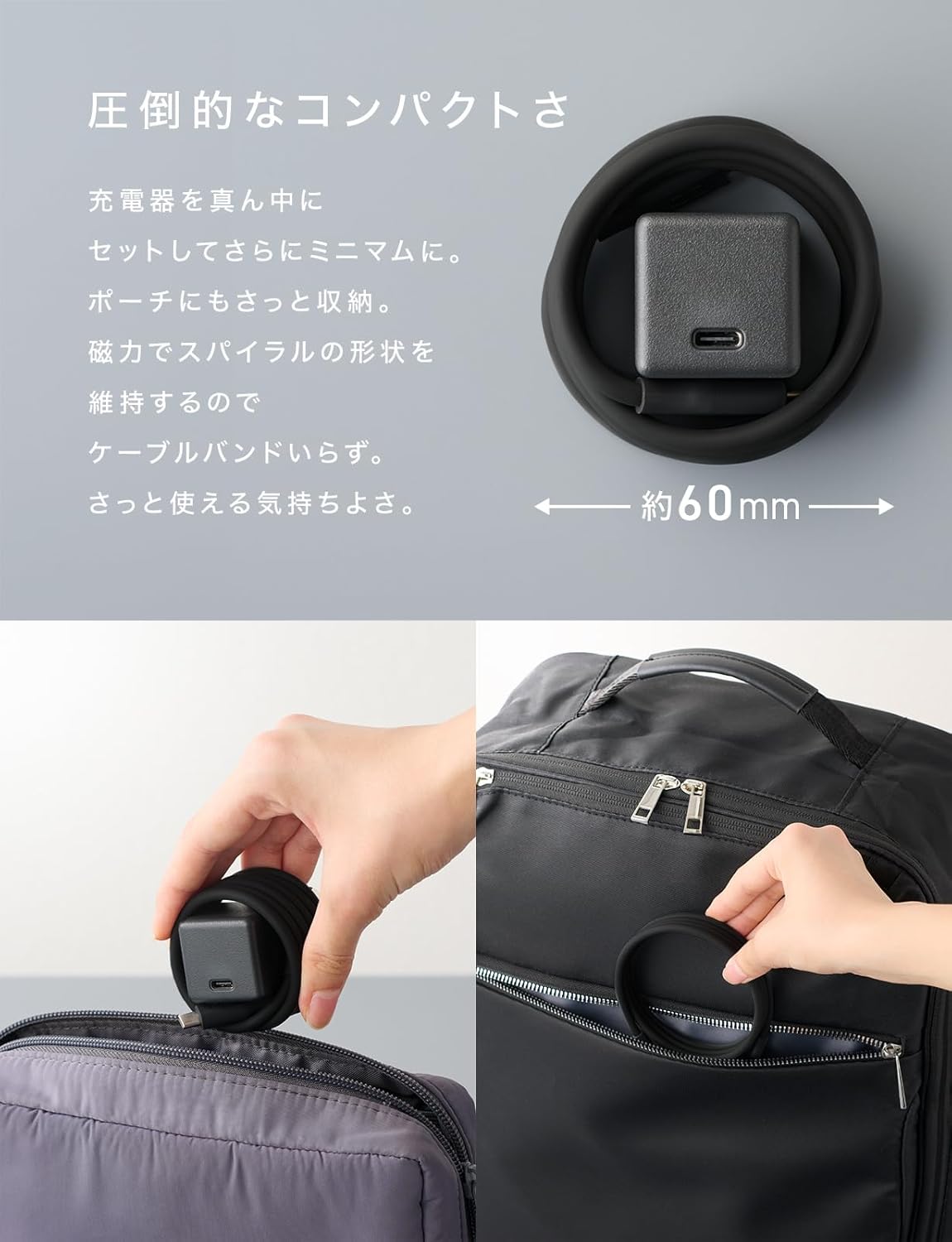 一方で、2m という長さでも、シリコン素材のしなやかさとマグネットによる整理機能があるため、巻いたときのサイズが大きくなりすぎることはなく、バッグの中に収納する際に場所を取りにくいという問題も発生しにくいです。このように、「SPIRAL SILICONE CABLE」の 2m の長さは、「室内での自由な使用」と「外出時の持ち運びの利便性」の両方をバランス良く満たす最適な設定と言えるでしょう。
