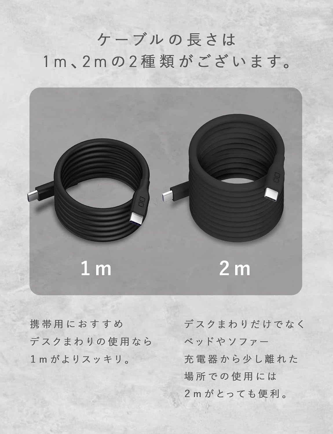 「SPIRAL SILICONE CABLE」の長さは2mに設定されています。これは、一般的に普及している 1m や 1.5m のケーブルに比べて長いため、充電器の設置場所やデバイスの置き場所に関する自由度が大幅に向上します。