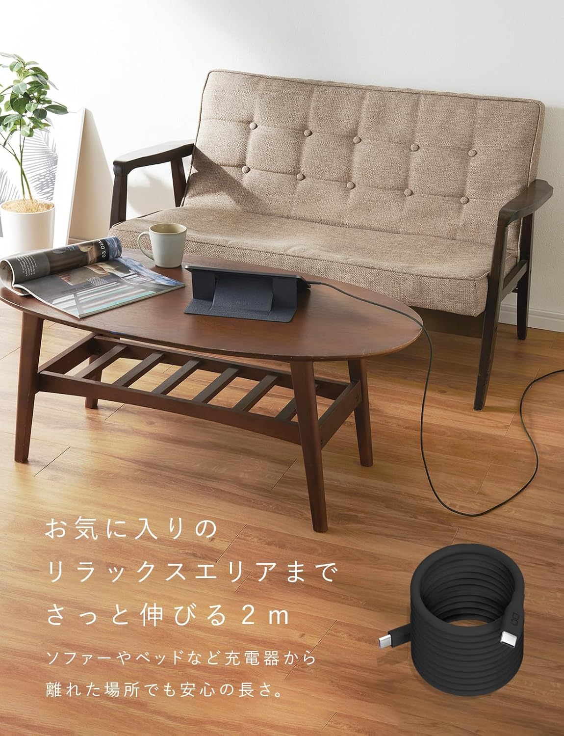 また、ベッドサイドのコンセントに充電器を接続し、ベッドの上でノートパソコンを使用しながら充電する場合も、2m の長さがあれば、ノートパソコンをベッドの上の任意の位置に置いたままで充電が可能になり、体勢を制限されることが少なくなります。さらに、ソファの横のコンセントに充電器を接続し、ソファに寝転がりながら iPad で動画を見ながら充電する場合でも、2m のケーブルであれば、iPad を手元に置きやすく、動画視聴の体験を妨げることがありません。