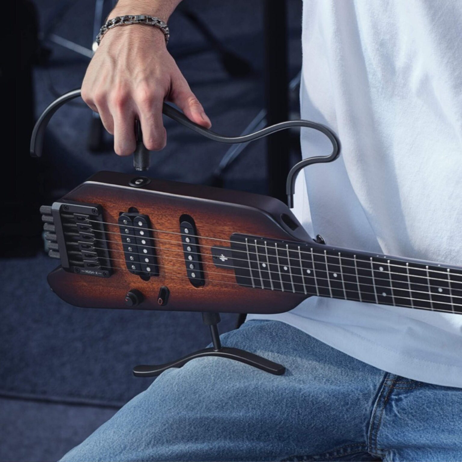 Donner HUSH™ X エレキギターの最大の特徴の一つは、軽量ヘッドレスギターとしての設計です。重量はわずか 4.4 ポンド(約 2kg)で、サイズは従来のエレキギターの半分に抑えられています。これにより、スーツケースやリュックに簡単に収納でき、出張や旅行に持っていく際の負担が大幅に軽減されます。例えば、ホテルの狭い部屋でもスペースを取ることなく練習でき、屋外のイベントでも簡単に持ち込んで演奏することが可能です。ヘッドレスデザインは、従来のギターが持つヘッド部の重量バランスの悪さを解消し、演奏中のギターの安定性も向上させています。手首への負担も少なく、長時間演奏しても疲れにくい設計になっています。