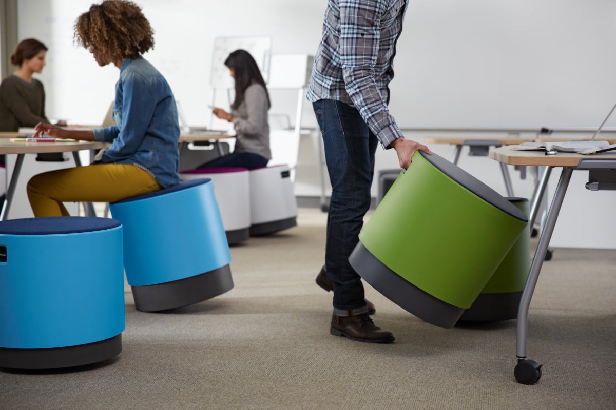さらに教室での使用も想定できます。学生は授業中、教師の説明を聞くために前かがみになったり、クラスメイトとディスカッションするために体を傾けたりするため、椅子は「動きやすさ」と「安定性」が求められます。Buoy のカーブしたベースはこの動きをサポートし、約 9kg の軽さは教師が教室の配置を変える時にも負担になりません。また、多彩なカラー選択で教室の雰囲気を明るくし、学生の学習意欲を高める効果も期待できます。